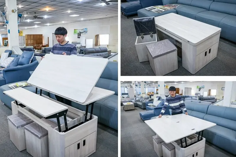 現在越來越注重收納功能,像這款就超值得推薦,價格大約在一萬出頭,而且桌板採升降設計,可以輕鬆從小桌變成大桌,不只如此,內部和兩側還有收納空間,椅子也能收納,完全解決空間不足的困擾。