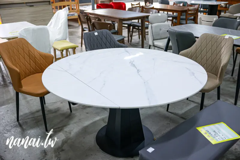 再來這區就是餐桌、餐椅!不管是圓桌、長桌,還是超實用的收納伸縮款樣樣有,能依照自家格局大小挑選。