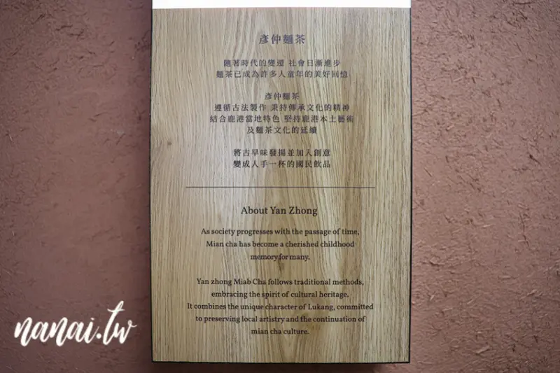 遵循古法製作,秉持文化精神,結合鹿港當地特色,堅持鹿港本土藝術,及麵茶文化的延續,因此將古早味發揚並加入創意,變成人手一杯的國民飲品,這就是彥仲麵茶的初衷。