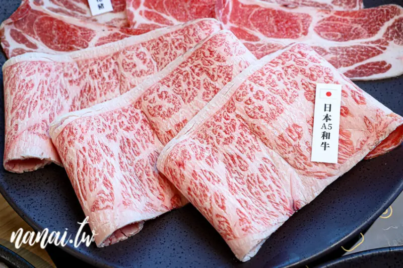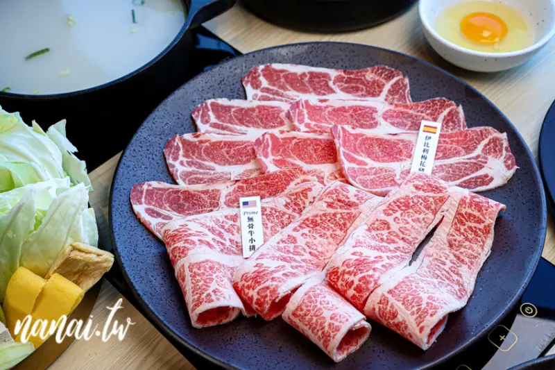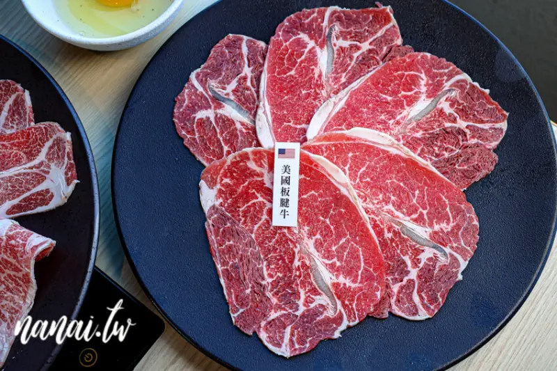 店家堅持選用原塊肉品,無使用重組肉,從肉質紋路即可看出用心,且肉品現點現切,而我們點了美國板腱牛,有著獨特的樹葉形狀,中央帶有一條透明肉筋,兩側油花分布恰到好處,將它在壽喜燒湯底涮煮,口感Q彈有勁且不油膩。