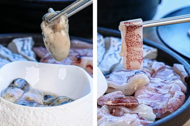 鮮蚵來自東石,肉質肥厚飽滿,一口咬下盡是滿滿鮮味,實在吃得有夠過癮。小卷搭配雞白湯一同煮,鮮味瞬間提升,緊實又彈牙肉質就瞬間被我ko。