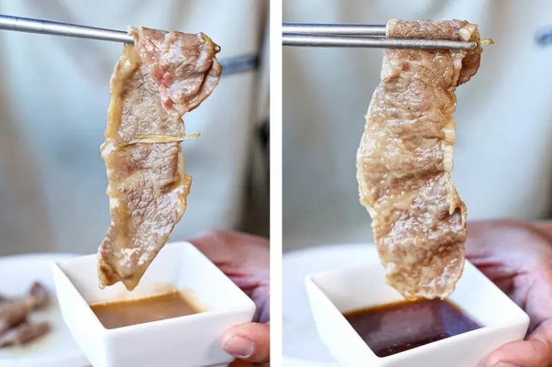 坊間多以沙茶醬或醬油為主,但店家特別提供兩種自家調製的日式沾醬,口感清爽更好能襯托肉品的鮮美。