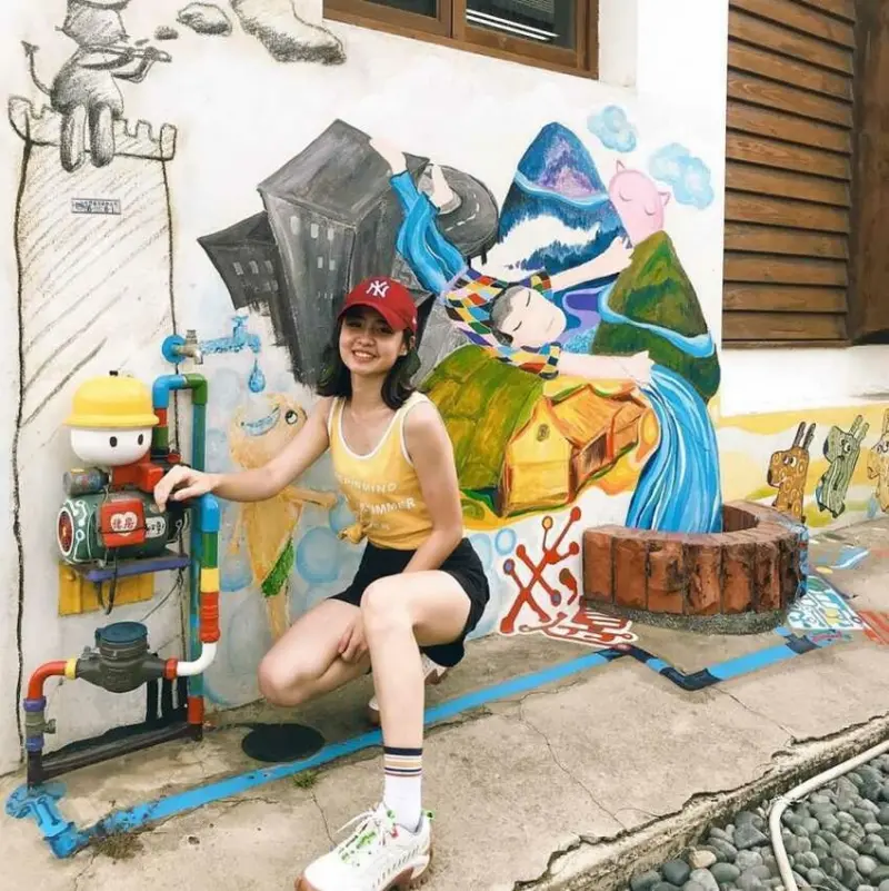 藝術村裡底片殺手之一,就是那在建築物的外牆上根據凹凸的形狀漆上七彩繽紛的顏色,包含水管、小水井、民宅窗戶變成公車車窗等創意十足,隔一段時間去還有機會發現有更新的畫作喔!