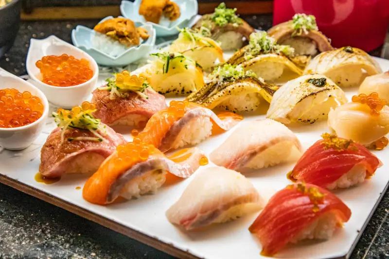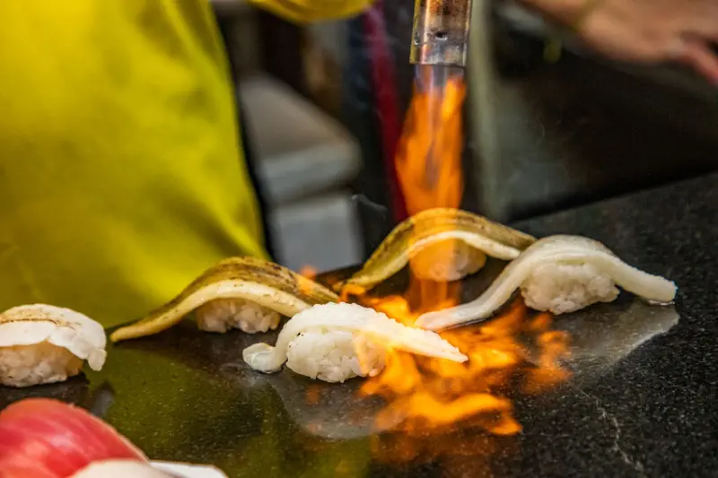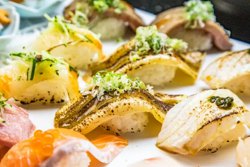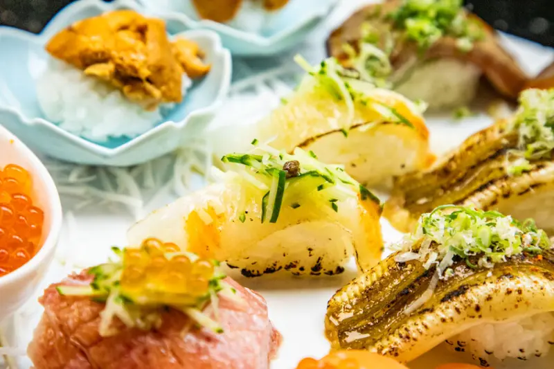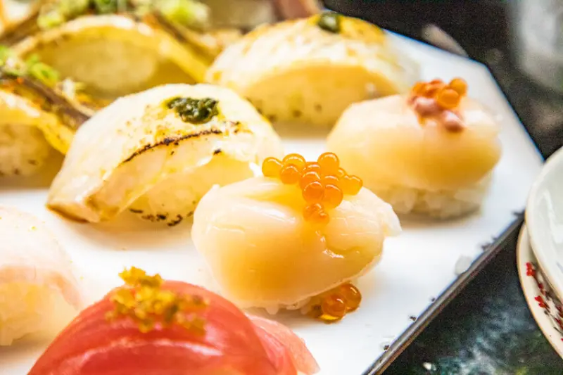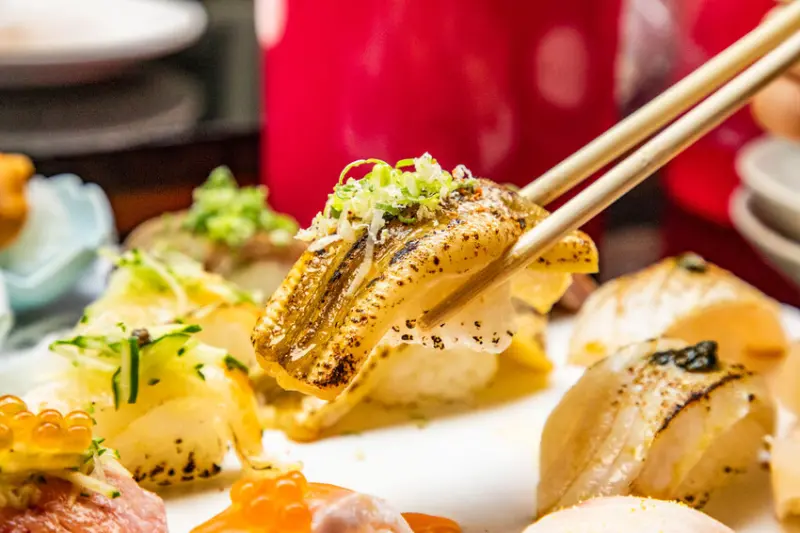 還有生食級的大干貝握壽司,那個干貝也是XXL等級的,一口咬下,鮮美的干貝肉汁直接在嘴裡大爆發,加上QQ的醋飯,口感層次非常豐富!