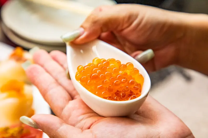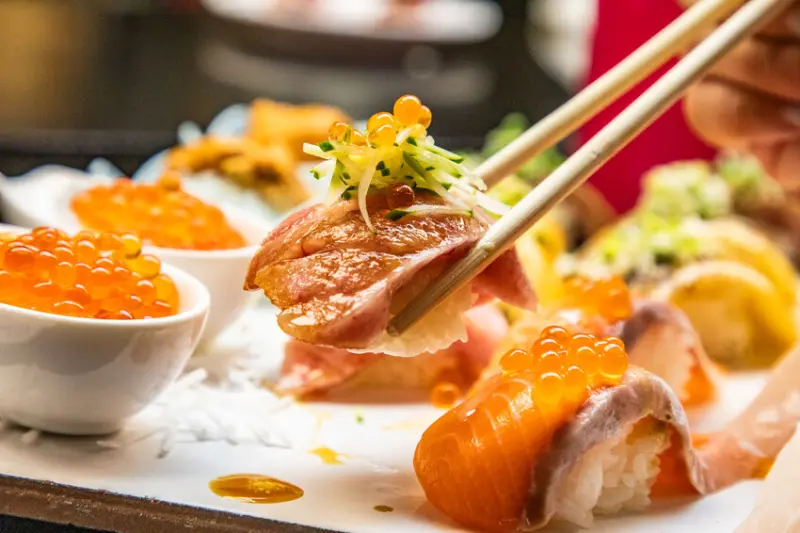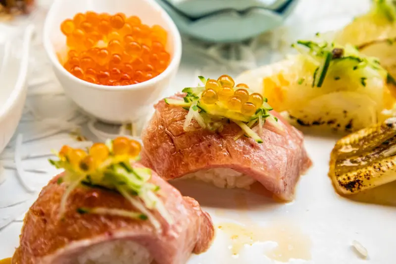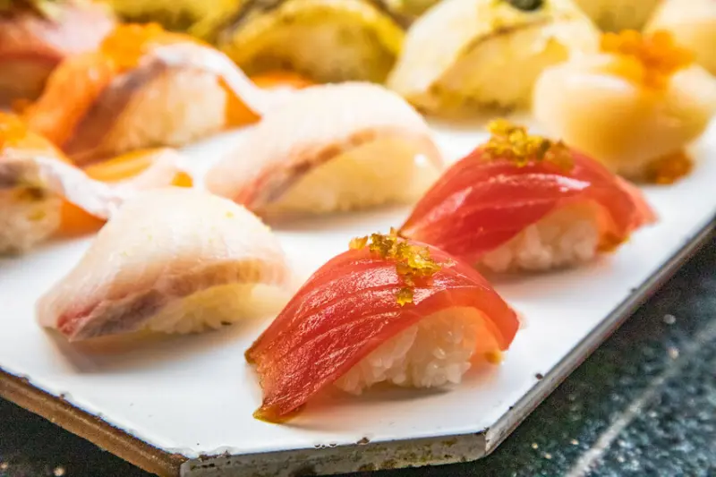 鮭魚親子握壽司的鮭魚切得非常大片又厚實,油脂感非常豐富,再加上鮭魚卵的鮮味,真的是握壽司界的不敗經典款!味道比較清爽的鮪魚赤身,主廚很用心地搭配了柚子胡椒,不僅可以降低赤身的鐵質味道,還可以提升魚肉的甜度和鮮味,超級好吃。