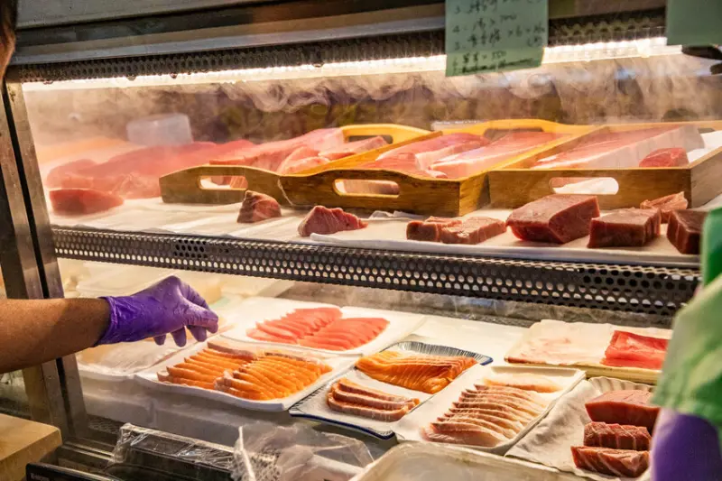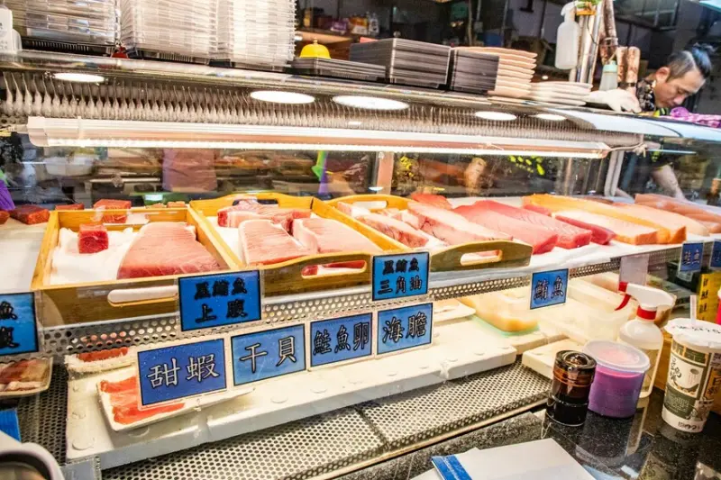 一到店裡,就會看到冷藏櫃裡面滿滿的生魚片,我們去的時候雖然已經不是黑鮪魚季了,但是攤位前面還是有新鮮的鮪魚,但多半是黃鰭鮪或大目鮪,也有之前急速冷凍的黑鮪魚。老闆說其實鮪魚這種東西很看季節,選對季節,不管是什麼種類的鮪魚都一樣好吃!而且他們家的生魚片都是客人點了之後,才會從冷藏櫃裡面拿出來現切的,保證新鮮。
