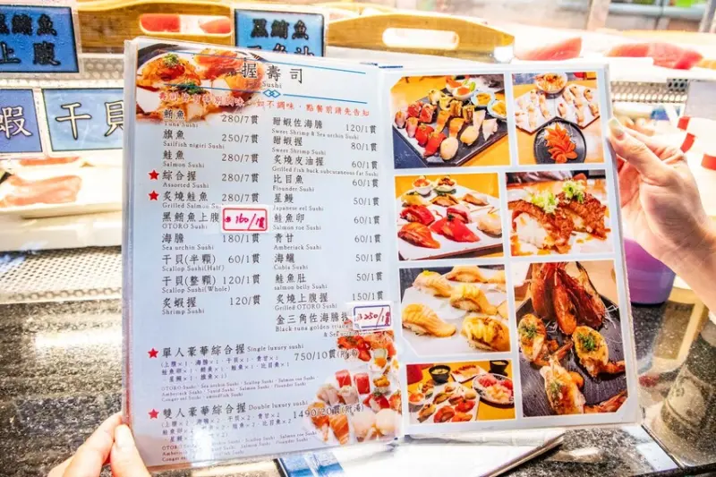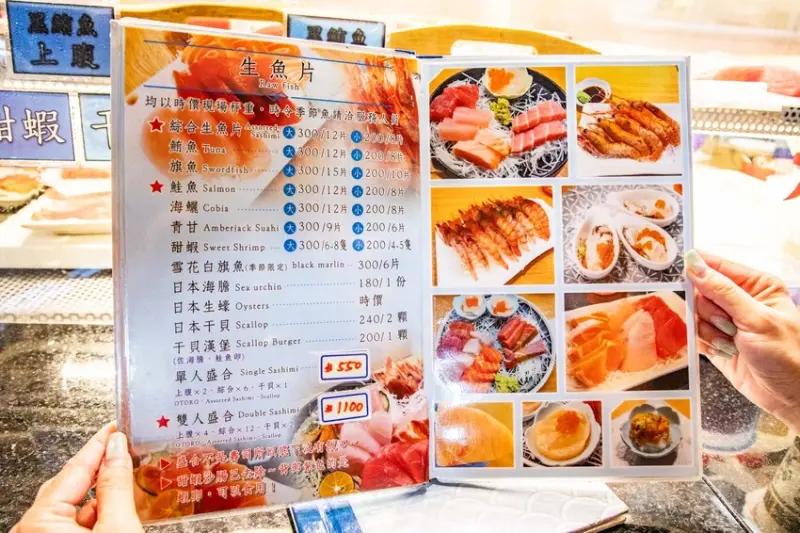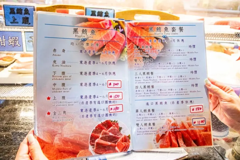 店員很親切地帶我們坐到吧台的位置,雖然是在市場裡面,但是他們的座位區非常乾淨整潔,椅子坐起來也很舒服,菜單也是圖文並茂,除了部分季節性的漁獲是時價之外,大部分的價格都標示得很清楚,而且不會很貴,他們家的握壽司真的很厲害,第一次來的朋友,我超級推薦你們一定要點綜合握壽司系列,因為裡面的食材都是很頂級的!