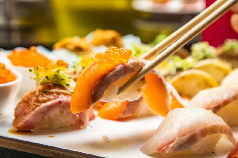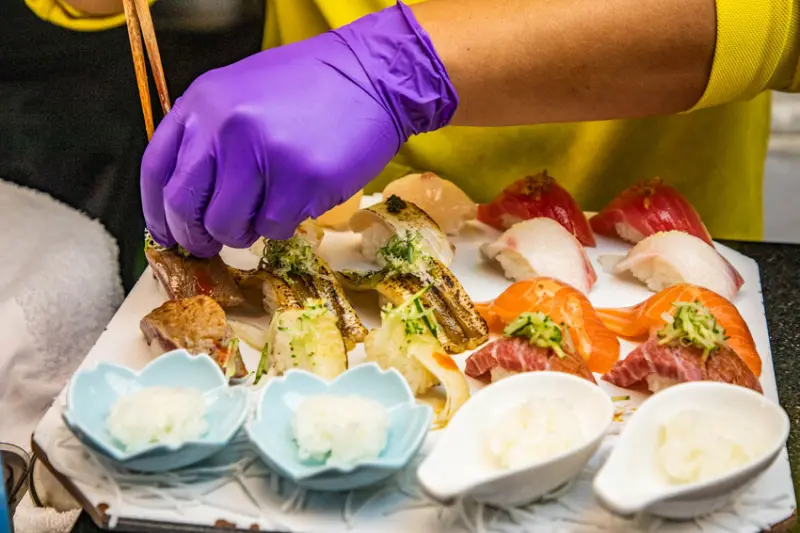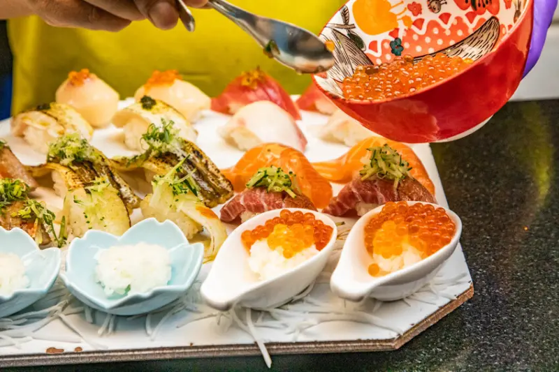 點完餐之後,師傅就會開始現場製作,整個製作的過程都看得到,超級安心,我們這次點的是雙人豪華綜合握壽司,這個在IG上真的是紅到不行,它不只是單純的握壽司而已喔,師傅會根據不同的魚種,用不同的方式調味或是料理呈現,說它是握壽司界的無菜單料理也不為過!