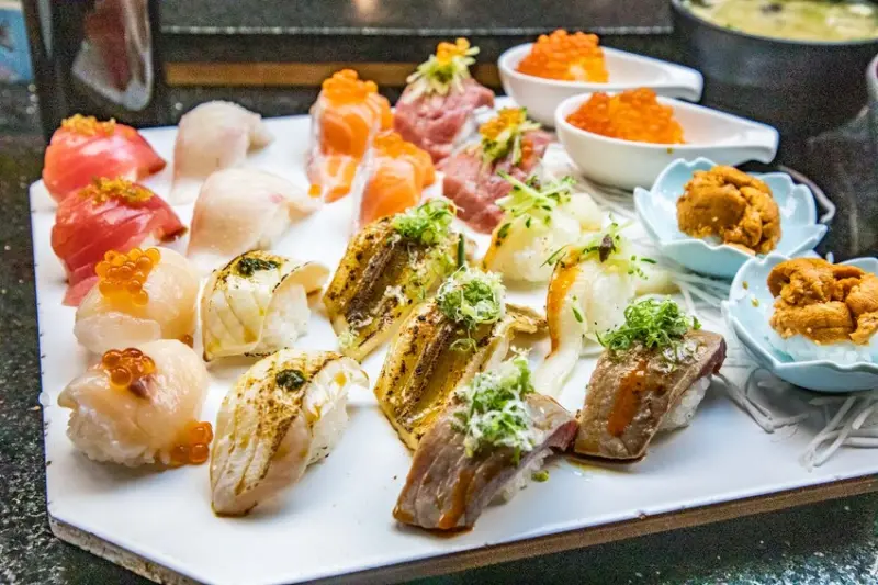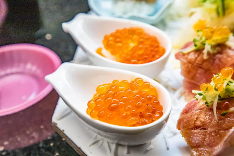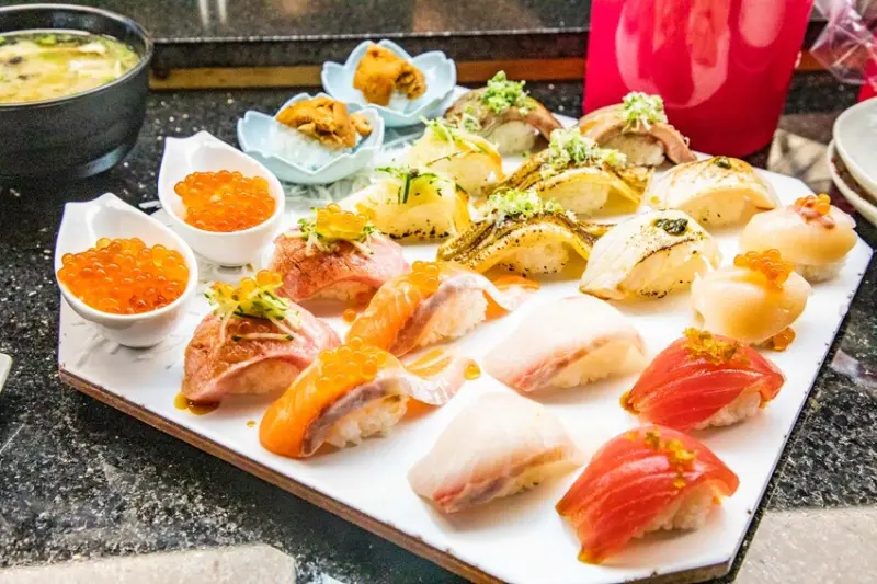 會點這個雙人豪華綜合握壽司,完全就是在IG上看到有人分享,看起來實在是太誘人了啦!但又怕照片是不是修太大,點之前我們還偷偷看一下別人點的樣子,結果一上桌,實物跟照片真的是一模一樣耶!這個擺盤的配色也太美了吧,就算放到高級的日本料理店賣也完全可以,而且食材用料都非常高級,像是海膽、鮪魚大腹、鮭魚卵等等,都是一流的食材!