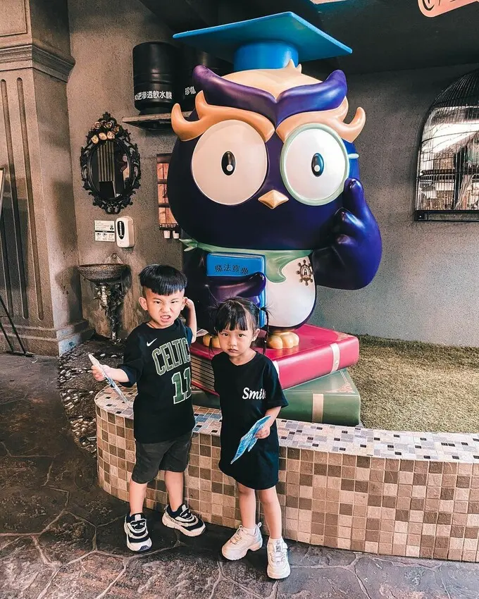 台灣優格餅乾學院可自由參觀不需收取門票,高達2層樓的大型精裝厚本書的入口處,是個拍照的好場景,穿越這個魔法書的巨門,進入一場與現實脫序的異次元世界,像魔法教室、大型厚裝書牆面、鐵甲站兵、貓頭鷹裝置藝術、天使翅膀、蒙娜麗莎畫像、西方彩繪玻璃⋯⋯等絕美藝術品,吸引大家在這拍照打卡。