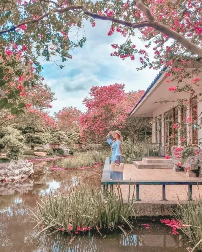 白色磚石造的茶館,佇立在水池內,池邊遍佈美麗的紫薇花樹,紫薇花色豔麗,花期又長(從6月開至9月,因此有「百日紅」之稱,也是庭園造景最常種的植物之一,粉紅花開時節,站在這裡眺望滿園景色,也像處在小日本般的優美。