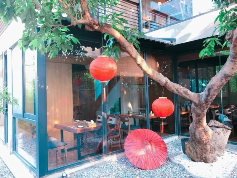 位於百果山半山腰處的合掌喫茶,大門外觀就十分雅緻,入門後,小巧美觀的日式庭園造景,三角形尖屋頂,搭配二層木造玻璃門建築,大樹垂蔭,順著青草石步道入內,空間明亮寬敞,大片透景玻璃,搭配木桌和木製皮椅,更顯質感。