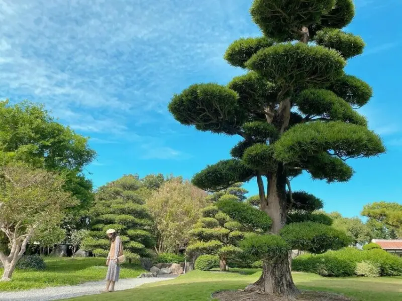 高大長青的松柏是日本庭園最喜愛種的植物,還有象牙樹、蘇鐵林、無憂樹等,池塘水流動,綠中點綴紅,修剪成圓長形狀的植栽,配上白色圓木柱,圓中有方,產生極簡的美感意象,時而可見優美盆栽,六角涼亭、石雕石椅分佈其中。