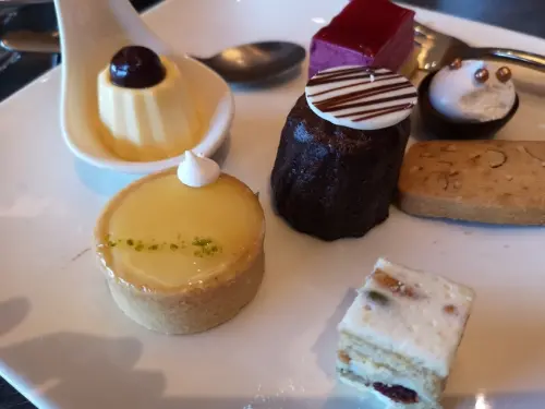 「台北喜來登大飯店十二廚自助餐廳」在1樓,從大門進去後左轉倒底的中庭區。挑高的空間以及閃閃發光的裝飾物,營造高級優雅的用餐氣氛,除此之外,餐點皆以「單人份料理」呈現,以達同桌不共食的防疫準則,如此高規格防疫,讓安妮王一夥人可以安心用餐,享受這些豪華的菜色。