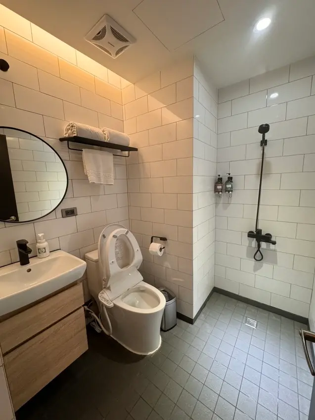 浴廁的部分有提供沐浴乳跟洗髮精,花灑的部分也很乾淨、水壓也很足夠、冷熱溫度也很好控制。