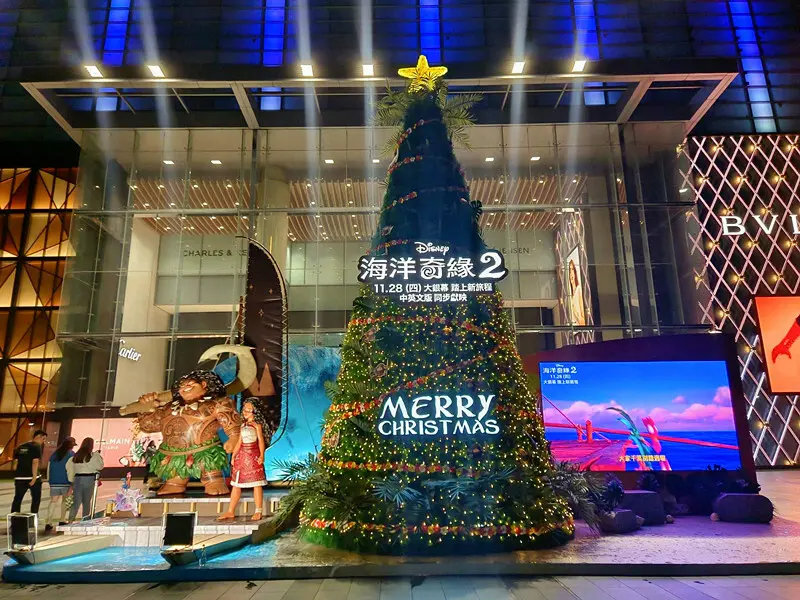 距離新光三越中港店只有50公尺的台中大遠百,當然也不能落後,跟以前一樣都以卡通為主,今年的主題是海洋奇緣2,除了聖誕樹還有主角人物塑像和旁邊的大銀幕