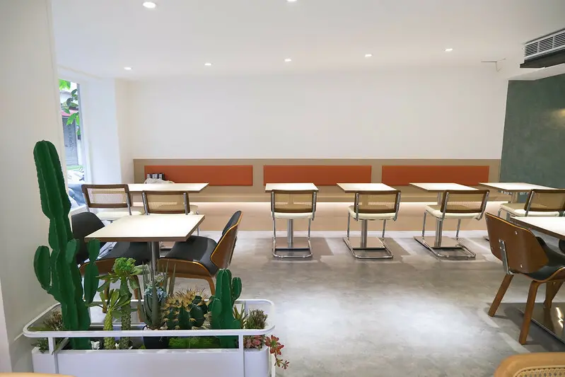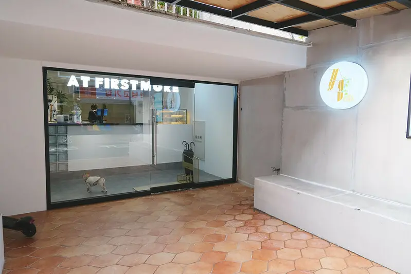 店外是簡約的水泥灰門面+大片落地窗,低調又有質感。