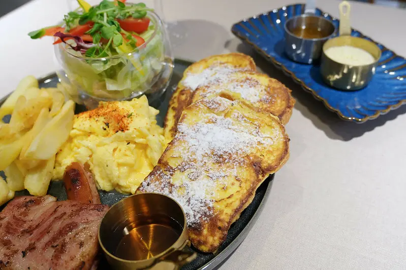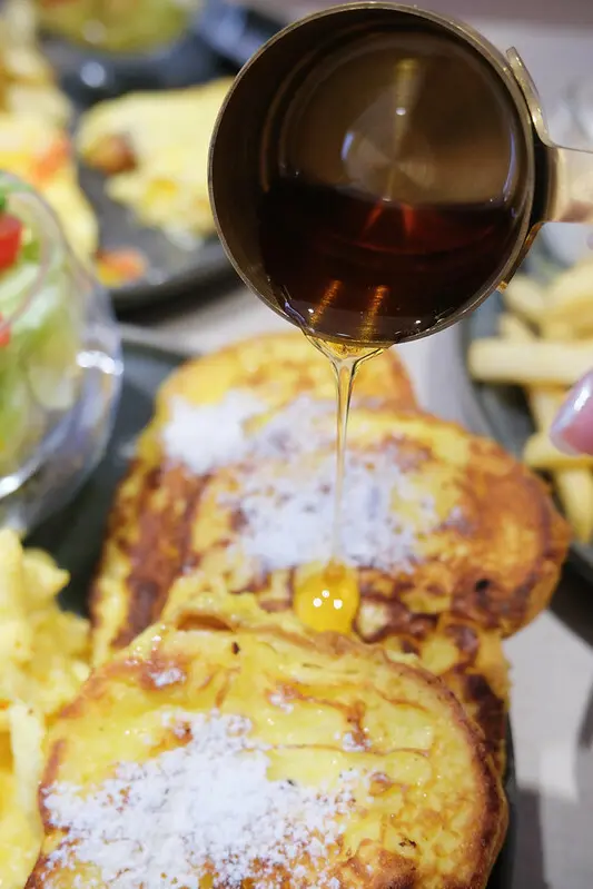 烤法式吐司再加上楓糖淋醬,甜鹹交錯超滿足。