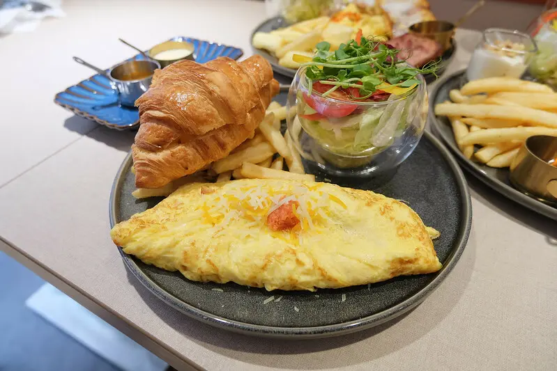 玉子燒歐姆蛋搭配可頌、沙拉及薯條,