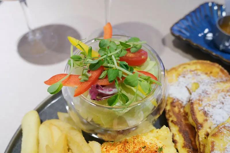 有嫩煎雞腿排、美式嫩蛋、黃金脆薯、法式吐司、沙拉及希臘優格盅。