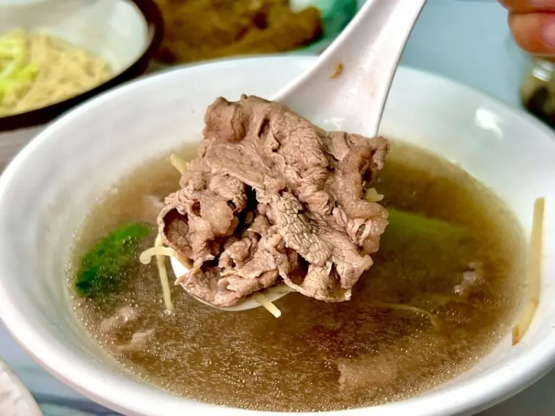 熱愛台南牛肉湯的我當然不回錯過「現沖牛肉湯」,只見店員俐落地將薄切美國CH級牛肉片放入碗中,再沖入熱騰騰、澄澈透亮的高湯,瞬間香氣四溢。牛肉片在熱湯中,顏色粉嫩、肉質軟嫩帶點肉的甜味。湯頭以大骨熬煮,加入些許泡過甘草與川芎的米酒,喝起來溫潤甘甜,尾韻帶點中藥的淡淡香氣,讓人從舌尖暖到心底。