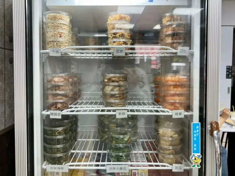 小菜用透明塑膠盒分裝,放置在冰箱中,讓顧客自行取用,