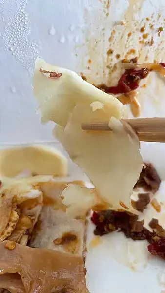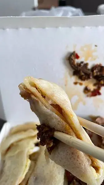 再來是他們的傳統蛋餅,這蛋餅很特別,竟然用了兩顆蛋耶!不知道吃起來是什麼感覺呢?它的外皮是用粉漿做的,但是整體吃起來的感覺有點像河粉皮,帶有一點彈性,但是又蠻軟的,聽說很適合牙口不好的老人家。