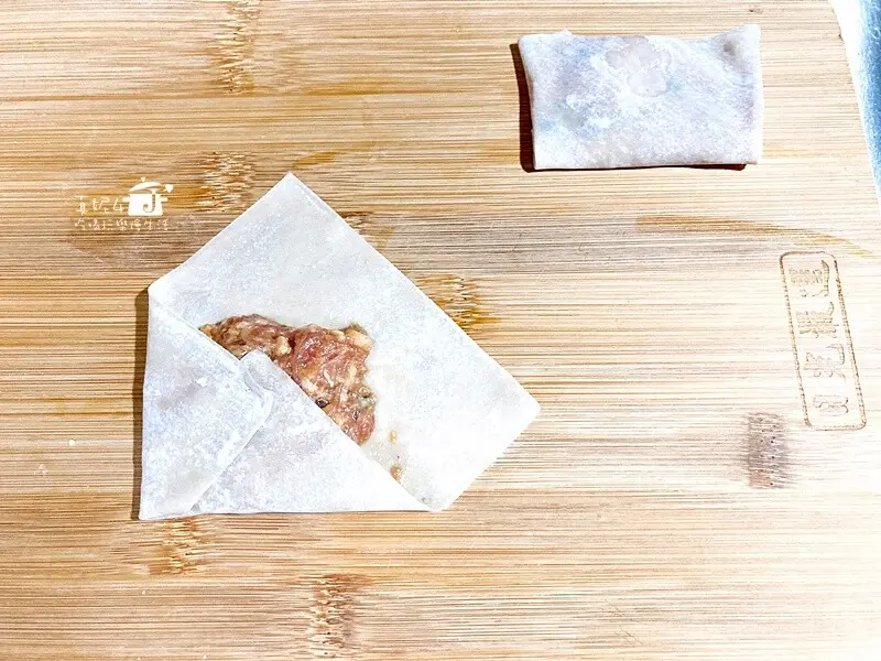 7.餛飩皮中間放適量肉餡,下往上收摺,左右收摺,上(尖角沾一點水)往中間蓋,收口朝下