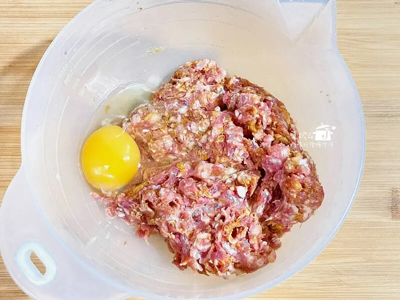 絞肉裡拌入雞蛋的液體成分再以同方向的混拌或是摔打到黏稠,肉質在吸收更多水份後口感就會滑嫩軟溜