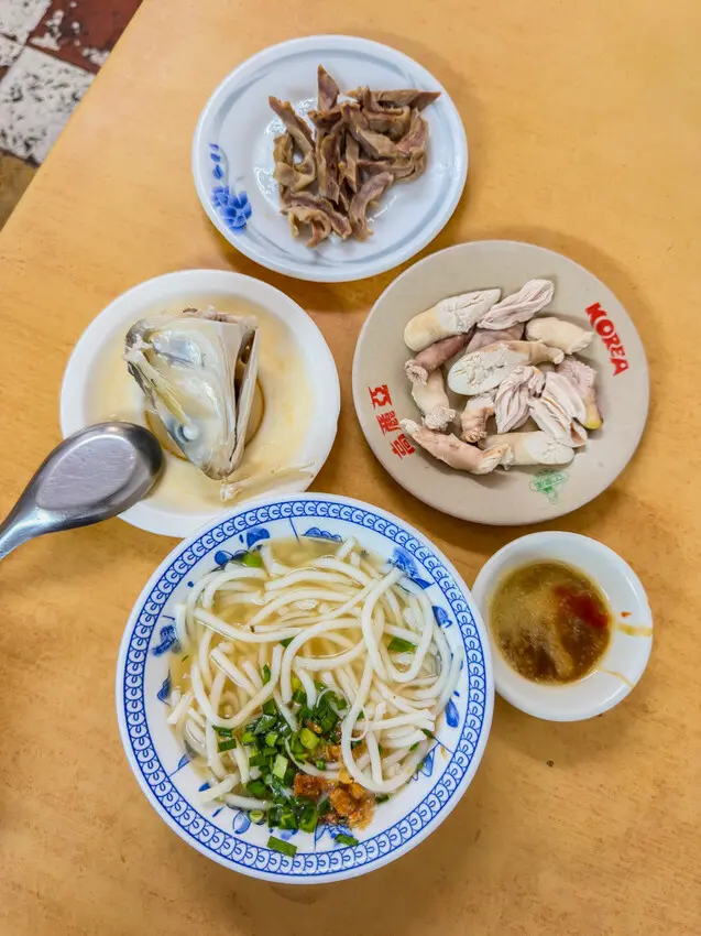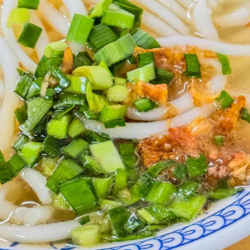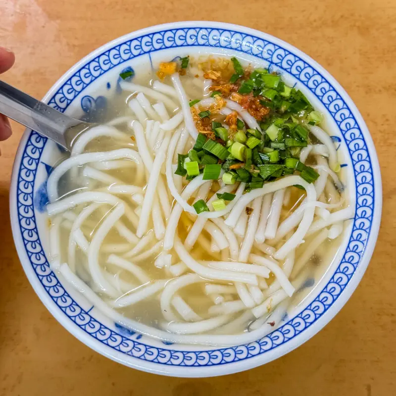 他們家的米粉湯看起來很清澈,湯底是用魚骨熬煮出來的,喝起來有魚的鮮甜味,而且感覺還有豐富的膠質。米粉吃起來QQ彈彈的,不會爛爛的,上面再撒一點蒜酥跟蔥花,雖然簡單但是很暖胃。