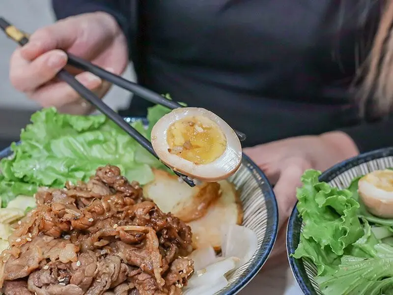 大火噴槍炙燒的牛五花,油花分布均勻,表面微微焦化,散發出誘人的香氣,搭配特調的丼飯醬汁簡直是絕配。混搭的米飯淋上醬汁後依舊粒粒分明,我個人覺得最畫龍點睛的就是搭配的美生菜,用生菜包著炙燒牛五花一起吃,就像在吃簡單版的燒肉,超讚。