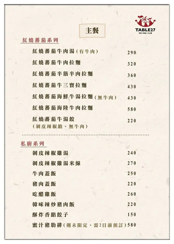 來看看「Table 27」的菜單吧!他們家主要分成紅燒蕃茄跟私廚兩種,蕃茄系列大部分都是麵食,價錢大概在$220~$580之間;私廚系列就有米線、蓋飯跟餃子,價錢差不多也是$150~$580。最下面還有週末限定的蜜汁豬肋排,要提前兩天預訂喔!這次我沒來得及預約,下次有機會再來吃吃看。