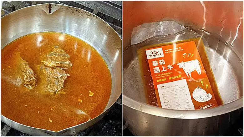老闆娘那天有親自示範牛肉湯的解凍方式,可以直接隔水加熱,也可以把包裝剪開,倒到鍋子裡面攪拌煮熱。聽說調理包的包裝是特別挑選過的,可以耐高溫直接放到鍋子裡面煮,對於平常很忙又沒時間的上班族來說,「Table 27」的宅配冷凍包真的是救急的好幫手,在家也能輕鬆煮出大師級的料理喔!