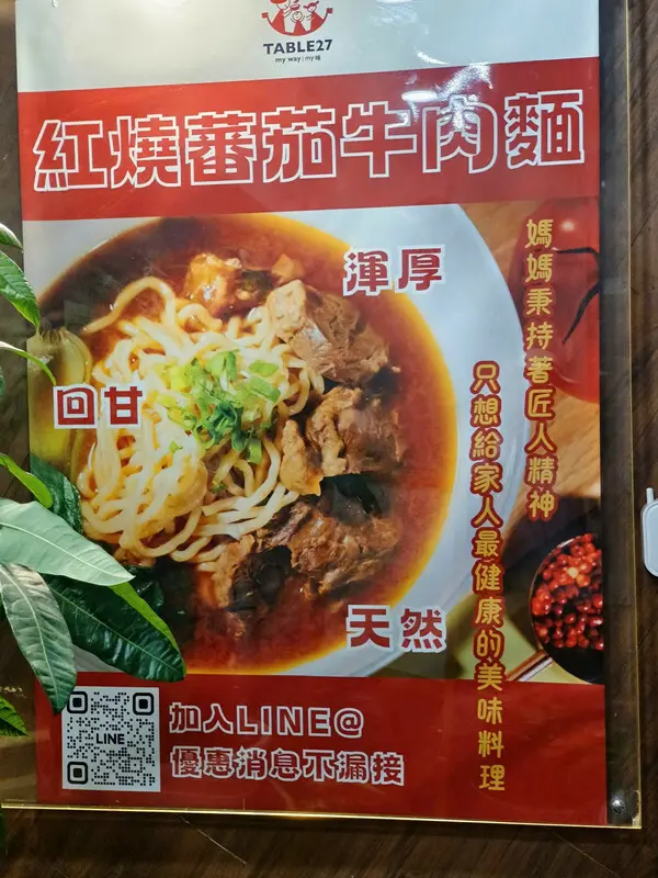 在大門旁邊有一個很大的輸出,上面就是在跟大家說他們家的招牌就是那個會回甘的紅燒蕃茄牛肉麵,還可以掃左下角的QR Code加入「Table 27」的Line好友喔!