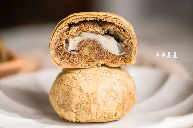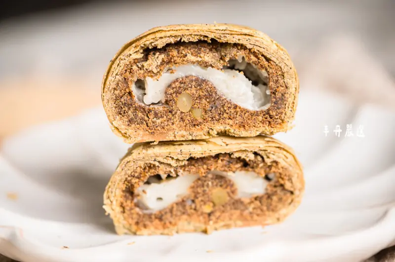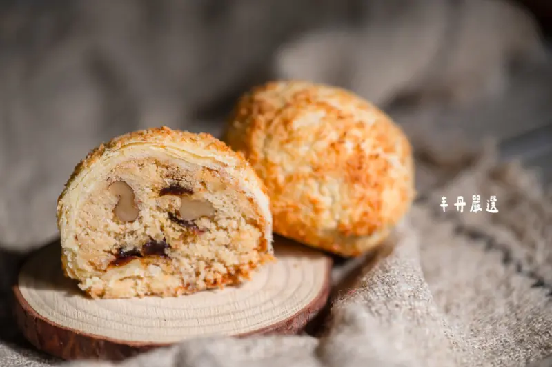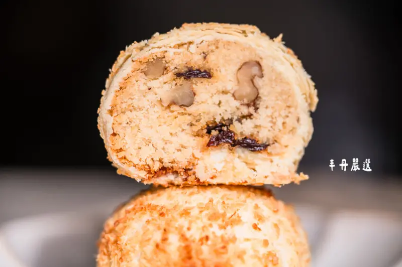 內餡使用獨家特製的綠豆皇,搭配天然且濃郁的椰子粉,再加入以蘭姆酒浸泡的葡萄果乾和烤核桃,吃起來帶有椰子與果乾的香氣,不僅香氣十足且口感豐富有層次。