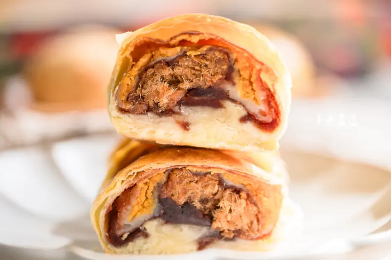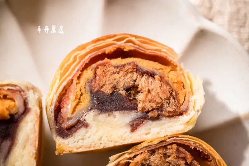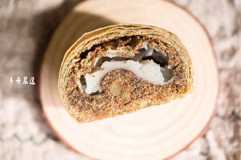 看看這剖面!還沒吃就可以先看到內餡的用料非常實在,裡面有用台灣豬後腿製作的肉脯、紅豆沙、鹹蛋黃、麻糬,鹹甜交織的多層次口感,忍不住一口接著一口啊!