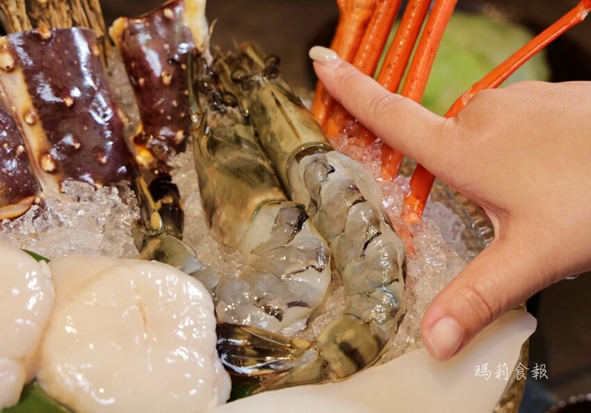 豪華海鮮盤的食材有:帝王蟹腳、松葉蟹腳、野生大花蝦、生食級日本北海道干貝、生食級野生砲管大軟絲,一看個頭就知道有特別挑過,賣相好浮誇。