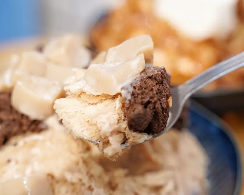 這碗「義美奶茶粉粿巧酥綿綿冰」,是義美食品與大碗公爆款聯名新品,把義美最熱銷的奶茶做成冰磚,茶香奶香通通鎖進綿綿冰裡,義美奶茶粉粿相當軟Q,還有義美巧克力酥片增添可可香氣及酥脆口感,整體甜度適中,我覺得還蠻好吃的。