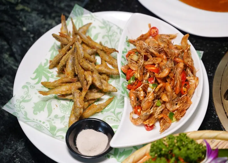 現炸的「鹽酥溪蝦」、「鹽酥溪魚」超級酥香,沾點胡椒鹽更涮嘴好吃。