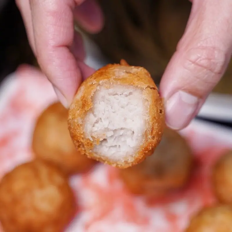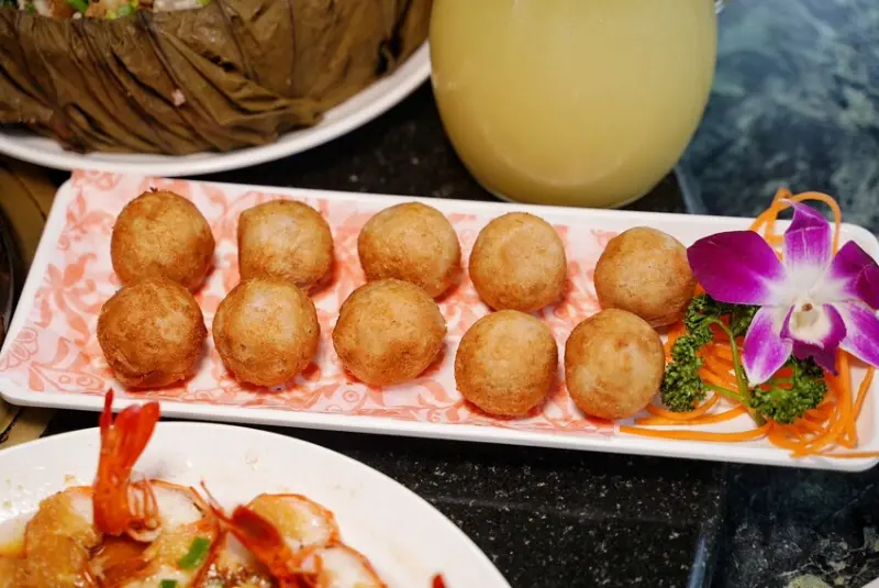 再來的「手工芋丸」,咬下去外皮薄脆,內餡濕潤又綿密,香甜芋香在嘴裡爆發真的很過癮,這道推薦必點!
