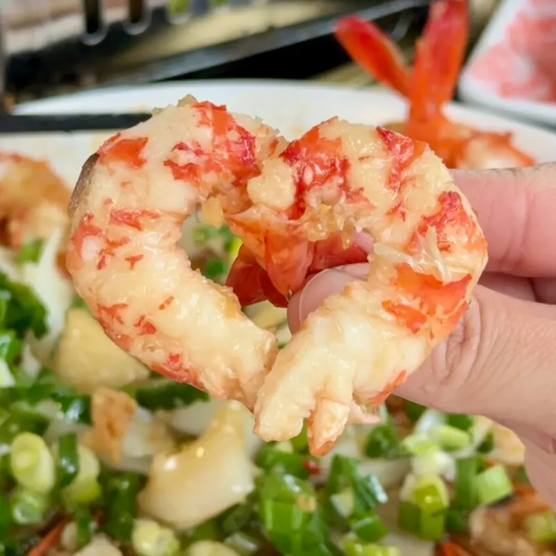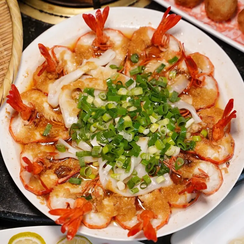 「蒜茸蒸草蝦」新鮮度完全不用懷疑,只要輕輕一撥蝦尾,蝦殼就自動脫落,變成可愛的愛心形狀~蝦肉Q彈又鮮甜,一旁還有美濃板條,淋上滿滿蒜泥,香氣撲鼻超誘人超下飯!