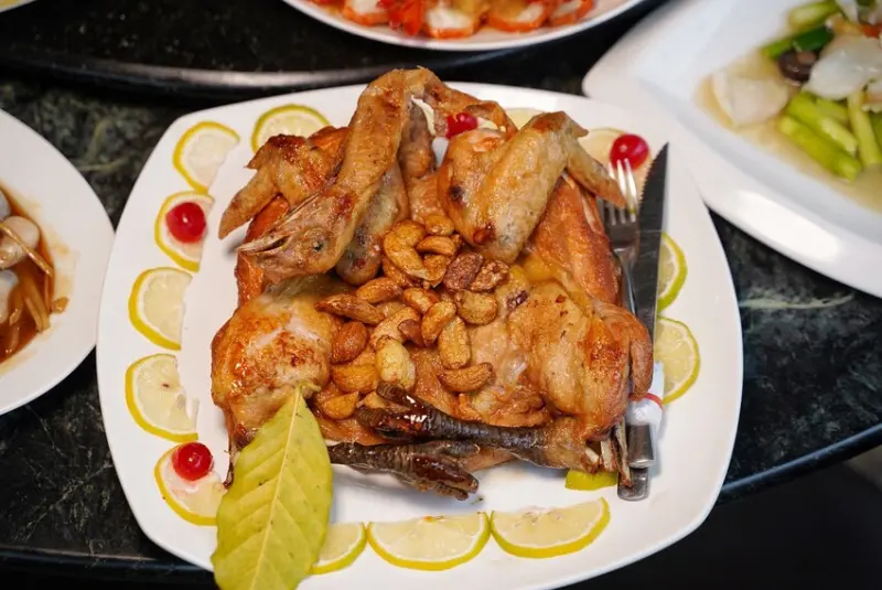 營業超過30年的平價土雞城「綠野山莊花園餐廳」你吃過嗎?要不是在地人帶路還真的不知道,更狂的是還有鐵道送餐服務,真的超級酷!整個「觀音山綠野山莊土雞城」腹地超大,花園裡還藏有百年蒸汽火車頭,還有價值不菲的雞舍,養著身價7萬的「藍寶堅尼雞」以及各頭超大的「梵天雞」,令人大開眼界。餐點光是雞肉料理就多達30種選擇,首推這道「招牌雞」,光是料理就要花費50分鐘,吃起來鮮嫩又多汁,還有外面很少見的「鹽焗烏骨雞」,皮Q肉嫩~更還有少見溫補又好喝的「雞仔豬肚鱉湯」,最讓我驚豔的還有綠野山莊花園餐廳的「菜脯芋頭絲」、「炸芋丸」,這兩道芋頭料理用料都超實在,芋頭控絕對不要錯過!