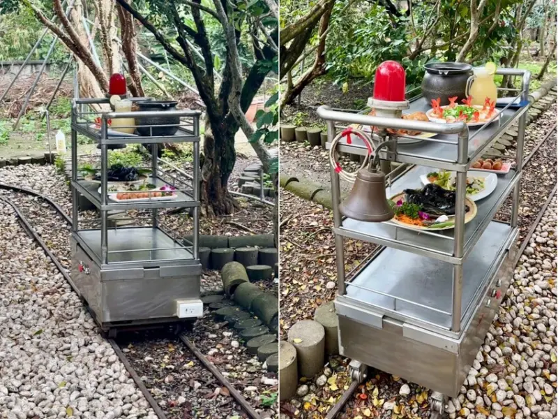 當天用餐坐在百年火車頭後方包廂內,跟友人點了滿滿一桌,別人都是用送餐機器人,這裡則是用可愛的鐵道小火車送餐,有趣又充滿鐵道氛圍感。