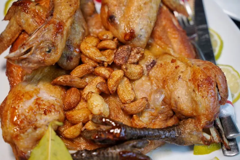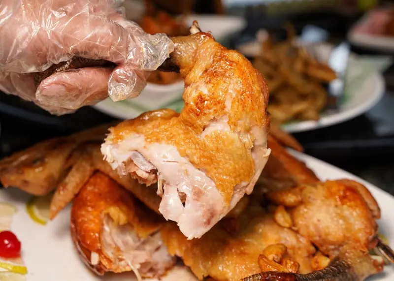 「招牌雞」光是料理就要花費50分鐘!費時又費工,雞肉烤至誘人的金黃色澤,搭配炸蒜頭一起吃更香更開胃。