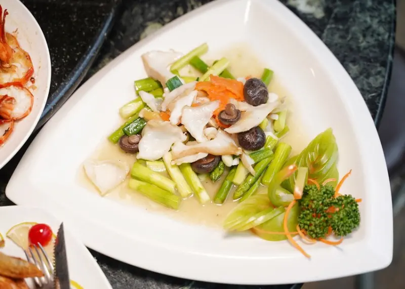 「蘆筍鮑魚」蘆筍口感特別爽脆,搭配鮑魚彈牙的口感,就是道色香味俱全的菜。