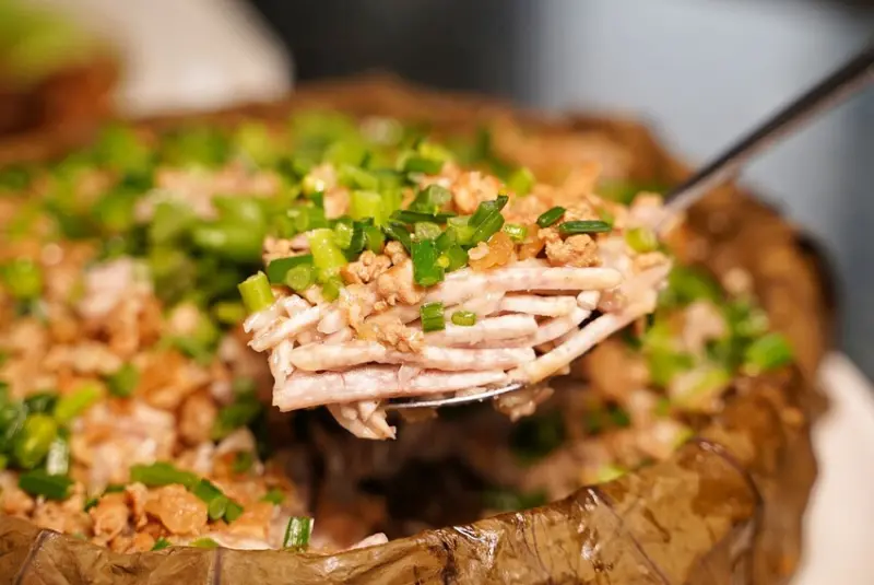 「菜脯芋頭絲」滿滿芋頭絲上鋪著香噴噴的肉燥,用荷葉包著蒸熟,每一口都是綿密芋香,用料超級實在,芋頭控絕對不要錯過!