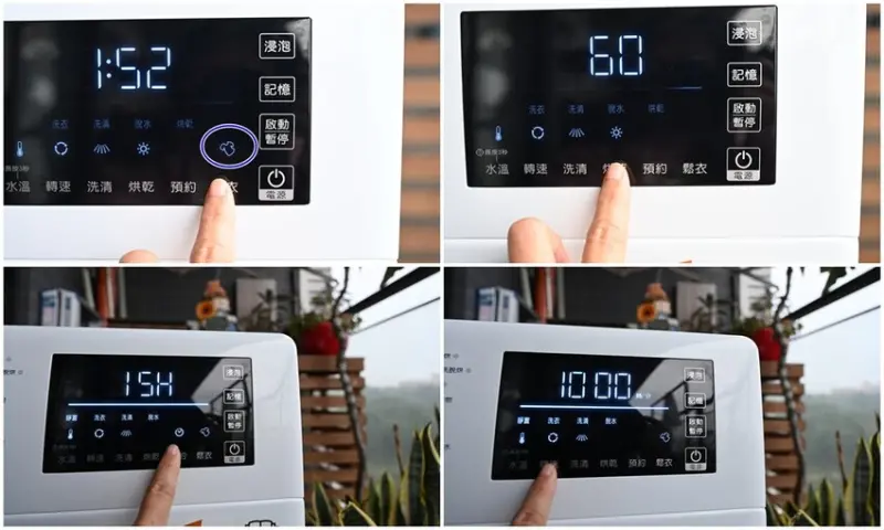 針對不同洗衣模式調整水溫,脫水轉速、洗清(回)、浸泡、預約、烘衣或是鬆衣行程,再按下啟動鍵即可。