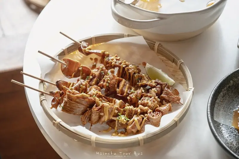 這個擺盤超特別,是用竹簍裝的!每一串都有豆包跟脆脆的杏鮑菇,搭配沙爹醬,整個味道超級搭,我個人超喜歡!