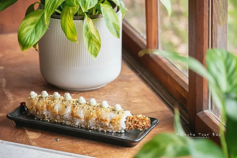 雖然看起來只是個飯捲,但是外面是用超薄的柑橘醃蘿蔔取代海苔來包米飯。 吃下去後,搭上飯上面甜甜的醬汁,整個超順口、讓人覺得很驚艷!