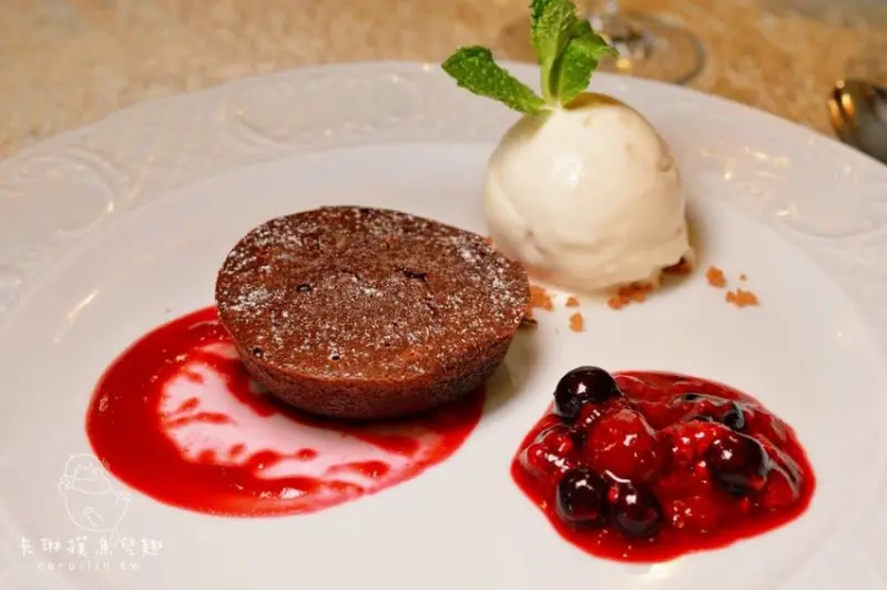 最後的甜點是溫溫熱熱的巧克力熔岩蛋糕,搭配香甜好吃的冰淇淋。